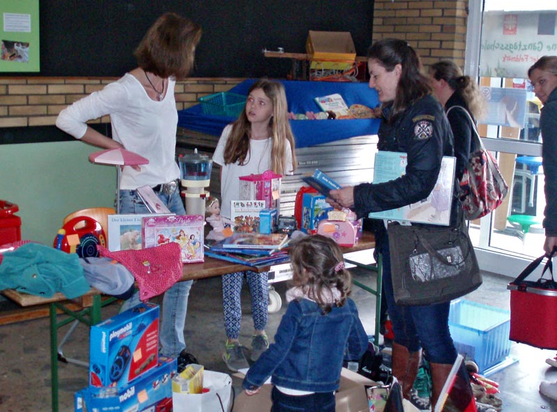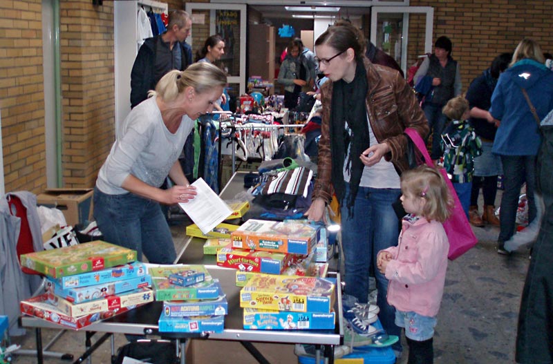 Am 1. April fühlte sich niemand in den April geschickt, der zum Trödelmarkt gekommen war. Schon bald nach Beginn der Aufbauarbeiten an den 16 Ständen waren die ersten Kaufinteressenten da, um sich die schönste Play-Mobil-Ritterburg, das größte Lego-Raumschiff oder das hübscheste Kleid zu sichern. Neben Kleidung gab es auch viele Spiele, interessante Bücher, aber auch CDs und DVDs zu erwerben. Der Förderverein lud in die Cafeteria ein, wo sich alle mit Kuchen, Saft oder Kaffee stärken konnten.