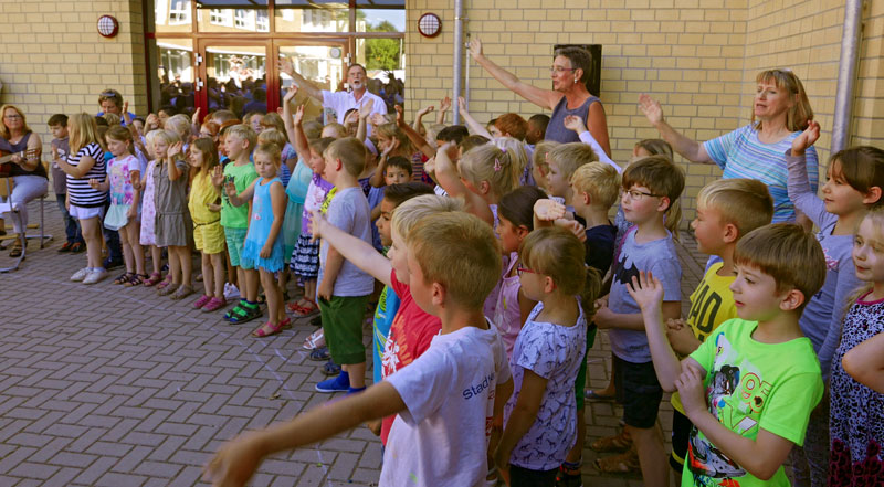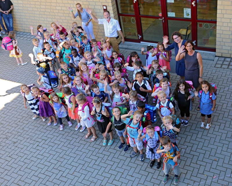 Nach einem schönen Gottesdienst in der Friedenskirche trafen sich alle auf dem Schulhof vor dem neuen Schulgebäude. Dort begrüßten die Kinder der Klassen 2a, 2b und 2c ihre neuen Schulkameraden mit fröhlichen Liedern. Nach einer kurzen Ansprache des Schulleiters Wolfgang Mömken ging es dann mit den Klassenlehrerinnen Frau Wegmann und Frau Seul zum ersten Unterricht in die Klassenräume. Die Eltern und ihre Gäste wurden in der Unterrichtszeit von Eltern des zweiten Jahrgangs mit Kaffee und Kuchen bewirtet.