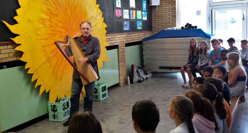 Um „seinen“ Schulkindern zum Abschied eine besondere Freude zu bereiten, hatte Herr Mömken den Märchenerzähler und Harfespieler Jörn-Uwe Wulf aus Ahrensburg nach Wesel eingeladen. Jeweils zwei Schulklassen konnten eine Schulstunde lang den Erzählungen lauschen, die Herr Wulf mit Musik aus seiner keltischen Harfe begleitete. Fasziniert ließen sich die Mädchen und Jungen in die Märchen hineinziehen oder konnten zum Teil auch mitmachen und mitspielen. Als Erinnerungsgeschenk erhielt jedes Kind einen „Märchenfalter“, ein mit einem Märchen und passenden Bildern bedrucktes Blatt, das die Kinder durch geschicktes Falten zu einem Buch umformen können.
