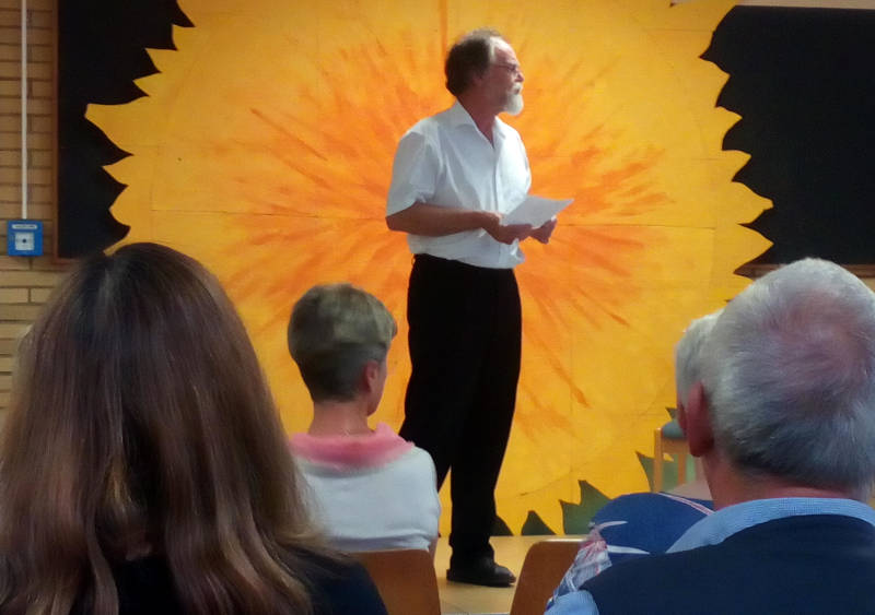 Am Abend des 3. Juli hatte Herr Mömken das pädagogische Team der GGS Feldmark, die Schulpflegschaft, besonders engagierte Wegbegleiter aus den vielen Jahren in Schulleitungsfunktion zu einem Dankeschön-Abend mit einer Märchenreise durch Europa eingeladen. Herr Wulf verwob geschickt verschiedenste Märchen so miteinander, dass die beinahe 2 Stunden lange Erzählung wie eine lange Geschichte erschien. Die Zuhörer waren begeistert. In der Pause und nach der Erzählreise blieb genügend Zeit, bei einem kleinen Imbiss und guten Getränken miteinander zu plaudern – und z.T. auch Erinnerungen aufzufrischen.