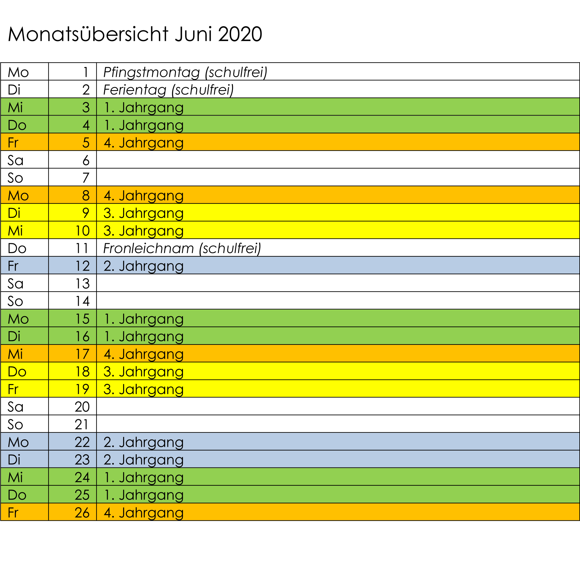 ab Montag (11.Mai) werden alle Kinder wieder in die Schule kommen können. Es darf an jedem Tag nur eine Jahrgangsstufe anwesend sein. Daher haben wir einen Plan erstellt, dem Sie entnehmen können, an welchen Tagen Ihr Kind Unterricht hat.