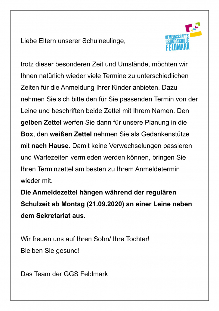 Terminvergabe für die Anmeldung der Schulneulinge ab Montag (21.09.20)