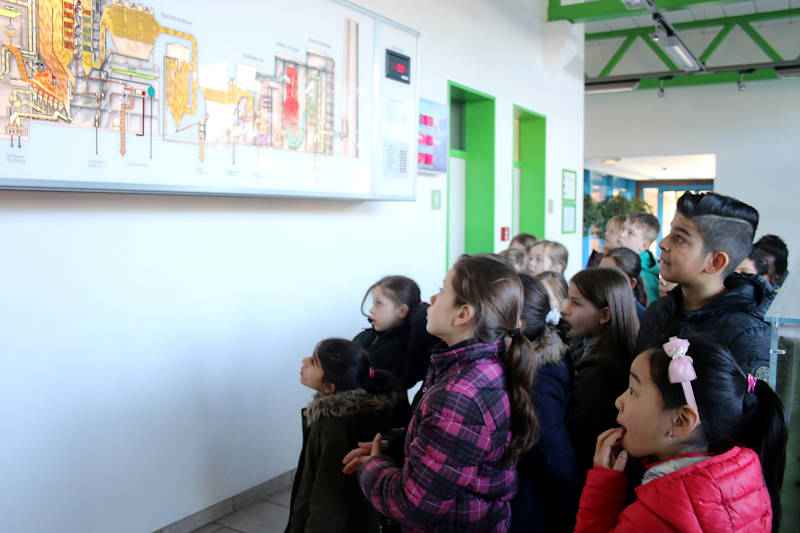 Nachdem alle Kinder mit Sicherheitshelm und Warnweste ausgestattet waren, erklärte sie zunächst im Schaubild, wie die Anlage arbeitet. Die Werte auf der Anzeigentafel machten schnell deutlich, dass diese Anlage zu den modernsten und saubersten in ganz Europa gehört und außer Kohlendioxid und Kohlenmonoxid kaum Schadstoffe an die Umwelt abgibt.