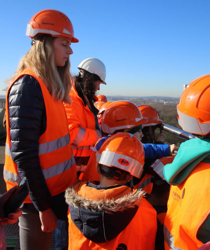 Bei der nächsten Station hoch oben unterm Dach konnten die Kinder durch eine dicke Glasscheibe in den Verbrennungsbereich schauen. Von dort führte eine lange Treppe auf das Dach. Da das Wetter gut war, konnten wir weit über das Land am Niederrhein schauen.